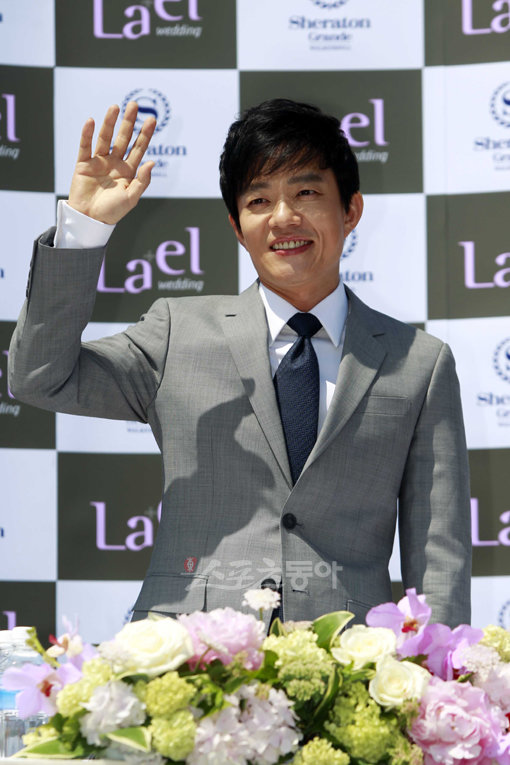 22일 결혼을 앞둔 배우 이범수가 14일 오전 서울 쉐라톤워커힐호텔에서 가진 결혼 기자회견에서 취재진들을 향해 손을 흔들고 있다.
