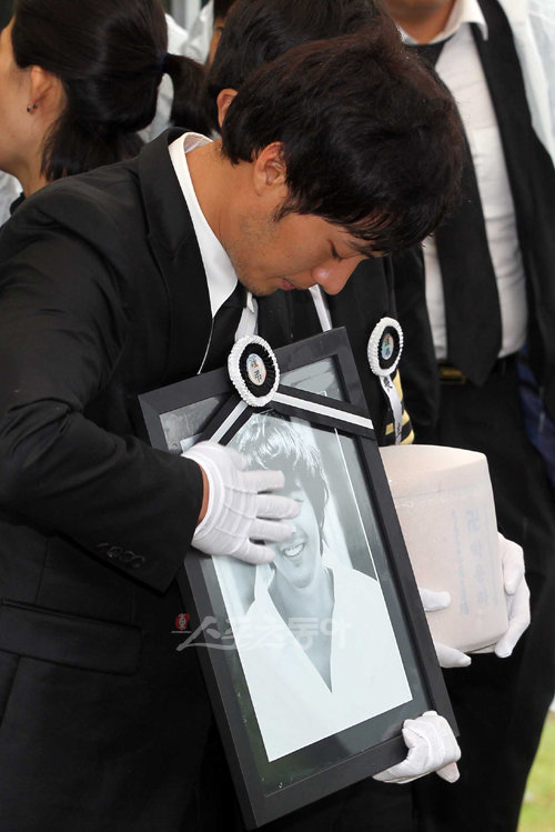 2일 오전 경기도 성남시 분당 메모리얼 파크에서 故 박용하의 납골식이 열린 가운데 배우 소지섭이 영정에 묻은 빗물을 닦고 있다.