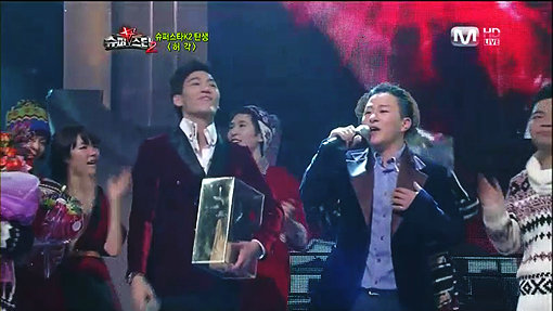 22일 밤 서울 경희대학교 평화의 전당에서 열린 케이블채널 Mnet ‘슈퍼스타K 2’에서 허각이 경쟁자인 존박을 물리치고 우승을 거며 쥐었다.