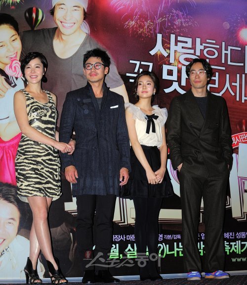 9일 오후 서울 왕십리CGV에서 열린 영화 ‘페스티발’의 언론시사회에 참석한 엄지원, 신하균, 백진희, 류승범(왼쪽부터)이 취재진들을 향해 포즈를 취하고 있다.