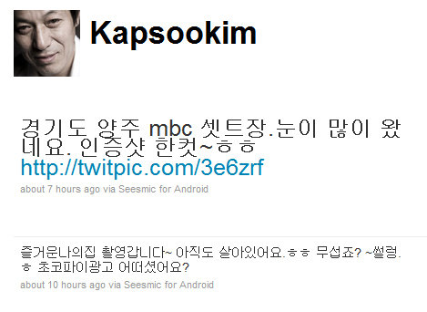 김갑수는 9일 자신의 트위터를 통해 “즐거운 나의 집 촬영갑니다~아직도 살아있어요ㅎㅎ 무섭죠?~썰렁”이라며 소식을 전했다. 또 경기도 양주 MBC 세트장에 눈이 많이 왔다며 인증사진도 잊지 않았다.
