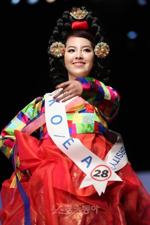 12일 오후 서울 광진구 광장동 쉐라톤워커힐호텔 씨어터홀에서 열린 ‘제 23회 월드미스유니버시티2010’본선 세계대회에서 한국 참가자 김수민(성균관대)씨가 전통의상 패션쇼에서 한복의 맵시를 뽐내고 있다.