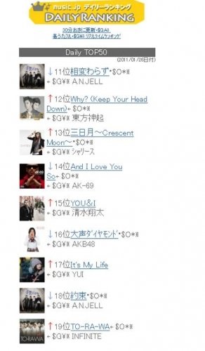 또한 일본 전체 음악들의 인기도를 볼 수 있는 제이팝 데일리 차트에서는 19위에 올랐다. 같은 날 싱글을 발표한 동방신기는 이 차트에서 12위를 차지했다.