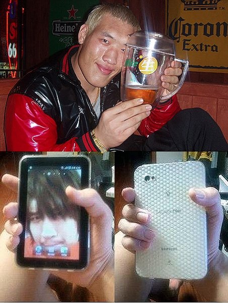 사진 속 최홍만은 맥주 3000cc를 마치 500cc 잔처럼 들고 있는가 하면, 갤럭시탭을 손에 쥐면 일반인의손에 쥐어진 갤럭시S와 외견상 큰 차이 없게 느껴진다.