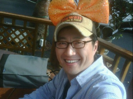 사진 속 박신양은 걸그룹 오렌지 캬라멜이 착용한 것과 비슷한 주황색 리본을 착용하고 환하게 웃고있다.