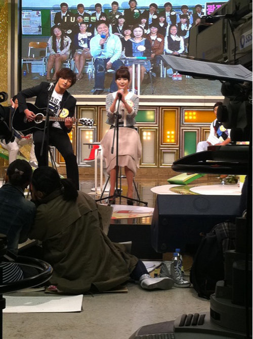 사진 속 아이유는 한눈에도 작은 머리 크기에 뛰어난 외모임을 알 수 있다. 아이유 옆에 '2AM'의 정진운이 앉아 있다. 사진을 본 누리꾼은 "오…언제 어디서 방송되나?"라며 방송을 기대했다.