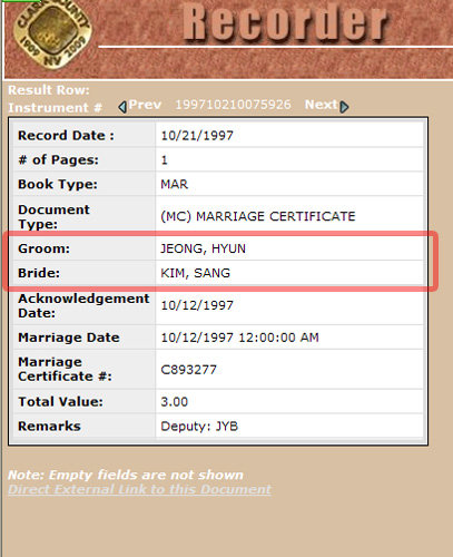 서태지와 이지아는 1997년 10월 21일 미국 네바다주에서 혼인 신고를 마쳤다. 사진은 네바다주 클라크 카운티 홈페이지에서 확인한 두 사람의 혼인 신고서.