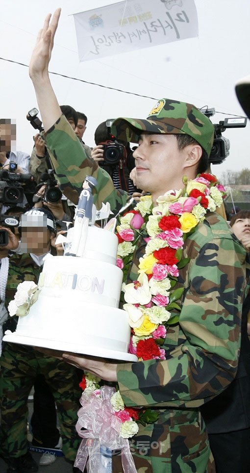 배우 조인성이 4일 오전 경기도 평택 오산공군작전사령부에서 군복무를 마치고 팬에게 받은 꽃다발과 케익을 들고 인사를 하고 있다.