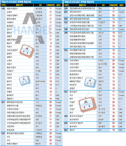 지역 기반의 케이블TV 업체 가운데 347만 가입자를 확보한 최대 사업자인 CJ헬로비전은 채널A에 양천 부천 부산 해운대를 비롯해 전남, 경남의 주요 지역에 앞자리(14번)를 부여했다.