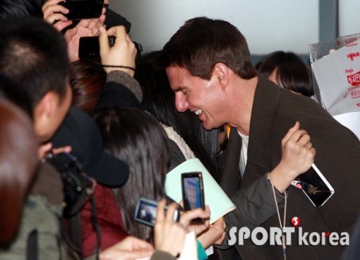 할리우드 배우 톰 크루즈가 영화 `미션 임파서블:고스트 프로토콜` 홍보차 2일 오전 인천국제공항을 통해 내한했다. 톰크루즈가 팬들을 안아주고 있다.