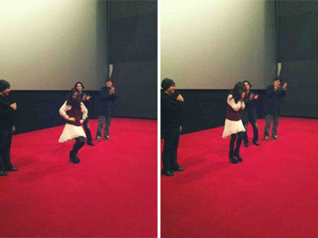 사진 속 손예진은 플레어스커트 차림에 긴 생머리를 휘날리며 섹시댄스를 선보였다. 부끄러운 표정을 지으면서도, 자신의 영화를 보러 온 관객들에게 깜짝 선물을 선사한 것.