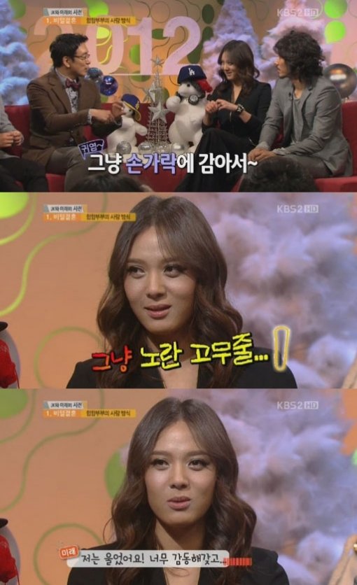 그러나 윤미래는 "너무 감동받아 울었다. 다이아몬드 반지같은 건 필요없다고 말하고 2만5천원짜리 가짜 다이아몬드 반지로 대신했다"고 밝혔다. 또 윤미래는 "이제는 다이아가 아닌 집을 사달라"고 말해 실속있는 주부의 모습을 드러내 웃음을 자아냈다.