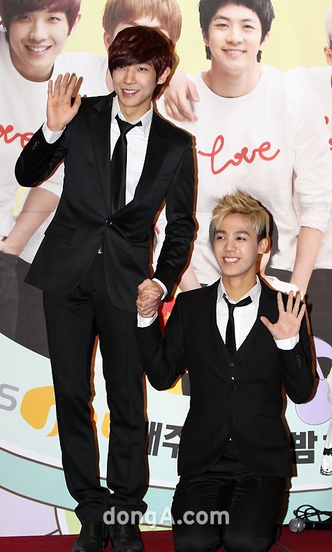 5인조 아이돌 그룹 엠블랙 멤버 이준과 미르가 16일 서울 강남구 노보텔앰배서더 강남에서 열린 KBS joy ‘헬로 베이비 시즌 5’ 제작발표회에서 포즈를 취하고 있다.