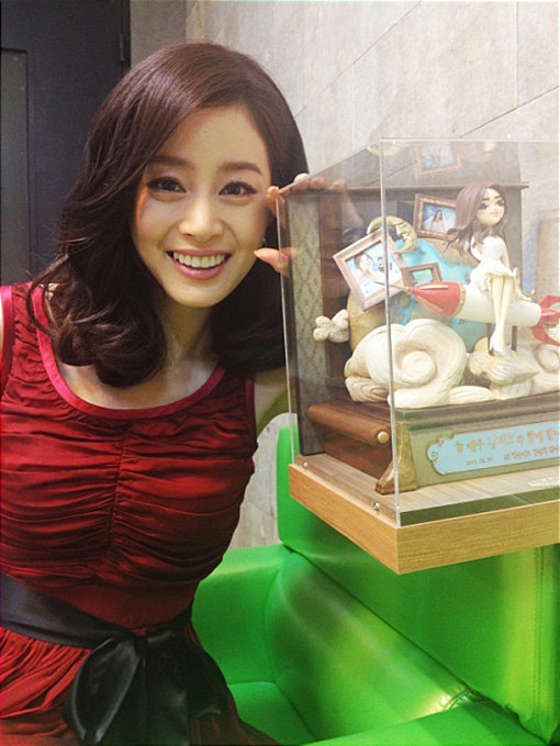 사진 속 김태희는 빨간색 드레스를 입고 팬들이 준 선물과 함께 우아한 포즈를 취하고 있다.