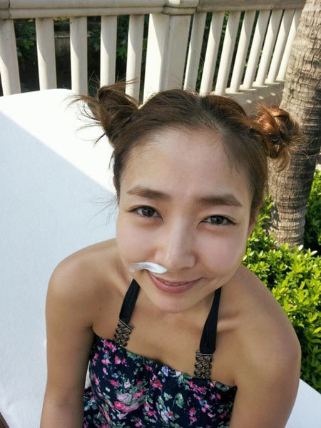 사진에는 진재영이 꽃무늬 점프 수트를 입고 머리를 양갈래로 땋아 올린 채 다양한 포즈를 취하고 있다. 특히 얼굴에 바르는 크림을 코 밑에 발라 마치 콧물을 흘리는 것처럼 보이게 해 시선을 모은 것.