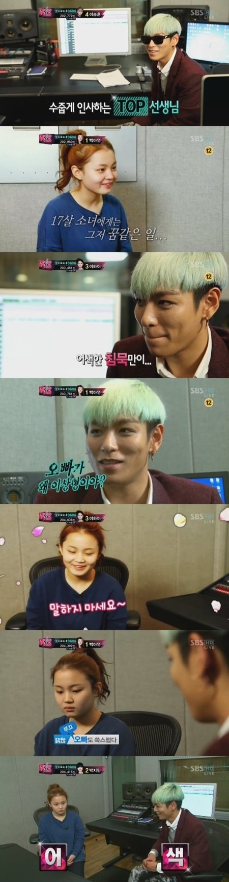 어색한 분위기를 깨기 위해 탑은 “오빠가 왜 이상형이야?”라고 묻자 이하이는 “말하지 마세요. 말 못하겠어요. 목소리가 너무 좋으세요”라고 겨우 말을 했다.