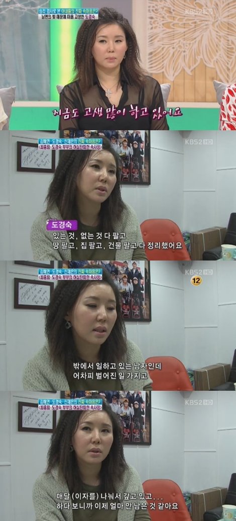 도경숙은 “이자만 한 달에 천만원 냈다”며 “경제권은 내가 갖고 있다. 남편이 버는 것보다 내가 더 많이 버니까 남편한테 아예 돈 달라는 얘기를 해본 적이 없다”고 말했다.
