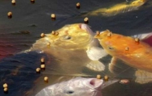 사진에는 물고기들이 물 위에 떠 있는 먹이 먹기 위해 입을 벌리고 있다. 하지만 수면이 얼어 있어 먹이에 입이 닿지 못하는 상황.