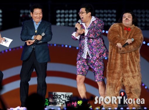 송영길 인천시장(왼쪽)이 9일 오후 인천 월드컵경기장에서 열린 ‘2012 인천 K-POP 콘서트’에 출연해 말춤을 선보이고 있다.