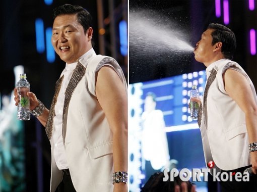 ‘국제가수’ 싸이가 5일 오후 강원도 춘천시 수변공원 야외무대에서 열린 건군 64주년 기념 `제62주년 춘천지구전투 전승행사` 특별공연 행사에 참석해 공연을 펼치던 중 물을 입에 머금었다 뿜고 있다.