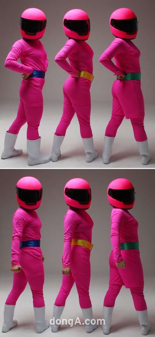 아담한 체격에 분홍색 전신 쫄쫄이를 입은 3인방, 이들은 개그 프로그램 선두 주자 ‘개그콘서트’ 새 코너 ‘핑크레이디’에 등장한다. 분홍색 헬멧과 흰색 장화로 패션의 마무리까지 신경쓴다. 본 기자가 사진을 촬영하는 동안 핑크레이디는 아무 말도 하지 않았다. 헬멧에 가려진 얼굴은 물론 신원 노출을 꺼렸기 때문이다. 이날 의사소통은 핑크레이디의 간단한 제스쳐와 부모 역을 맡은 김장군과 조승희의 통역(?)으로 대신했다.