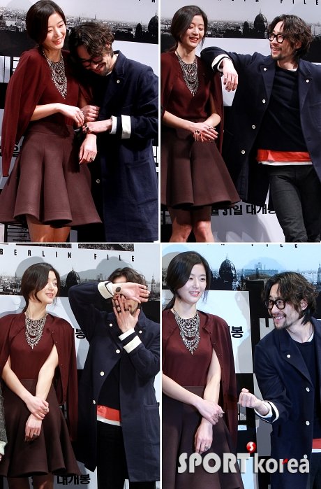 배우 류승범(오른쪽)이 7일 오전 서울 압구정CGV에서 열린 영화 ‘베를린’(감독 류승완) 제작발표회에 참석해 포즈를 취하는 도중 전지현에 깨알 애교를 부리고 있다.
