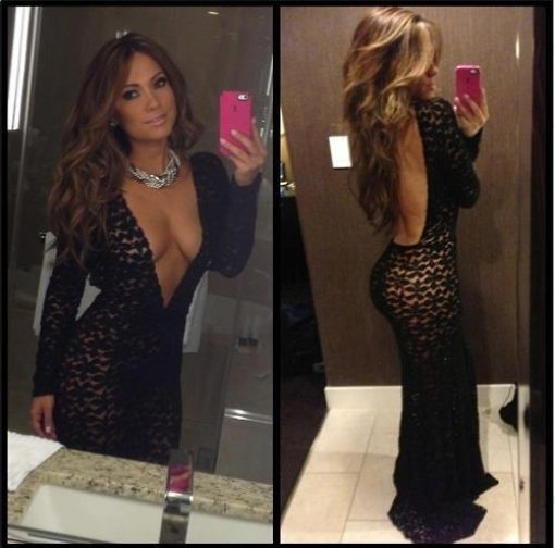 사진은 로페즈가 직접 찍어 공개한 드레스 셀카. 사진에서 로페즈가 입은 드레스는 앞부분이 배꼽 근처까지 파여 배꼽까지 파여 상반신의 절반 가량이 드러나 있다. 특히 로페즈의 볼륨감 넘치는 가슴이 돋보이는 디자인.