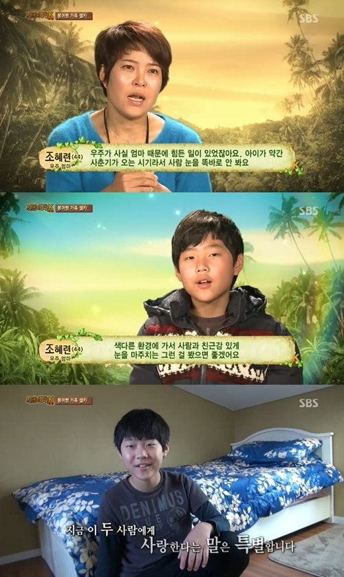 조혜련은 11일 방송된 SBS ‘정글의 법칙K’에서 “아들 우주가 나 때문에 힘든 일을 겪었다. 사춘기가 오는 시기라 사람 눈을 똑바로 안 본다”고 말했다.