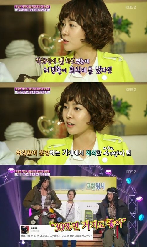 최윤영은 “저번주 허경환의 가게에서 회식을 했다. 박해진이 낼 차례였는데 허경환이 대신 내줬다. 돈이 정말 많이 나왔다. 시청률 30%를 돌파했을 때 박해진이 ‘개그콘서트’에 출연한 인연으로 계산한 것 같다”고 밝혔다.