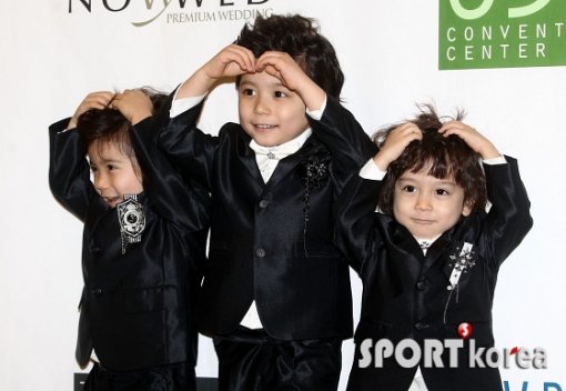 아역배우 문메이든, 문메이슨, 문메이빈(왼쪽부터) 형제가 22일 저녁 서울시 여의도동 63시티에서 열린 ‘윤형빈-정경미 결혼식’에 참석해 포즈를 취하고 있다.