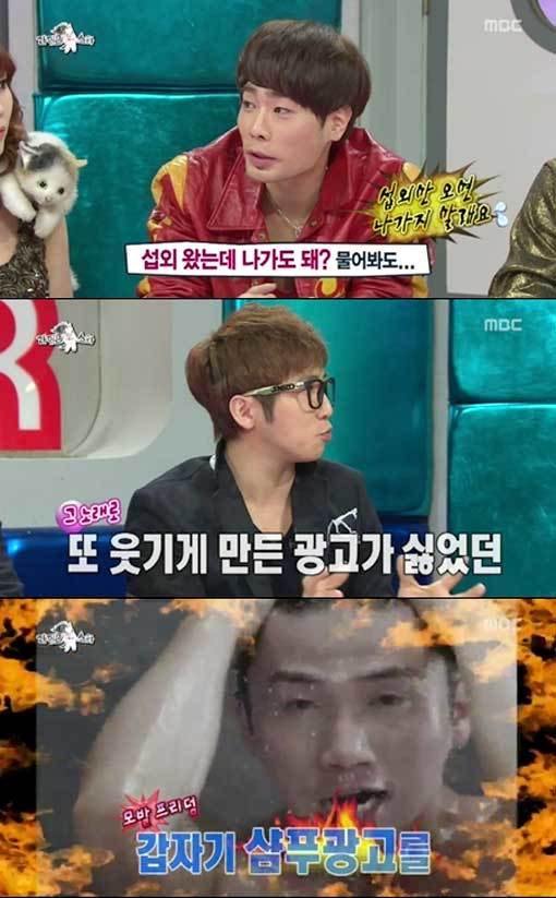 그 말에 뮤지는 “거의 10억(원) 가까이를 취소했다”며 “나한텐 찍으면 안된다 하더니 자긴 샴푸 CF를 찍었다. 웃기는거 싫다더니 바퀴벌레 잡는 CF도 찍었다”고 밝혀 웃음을 자아냈다.