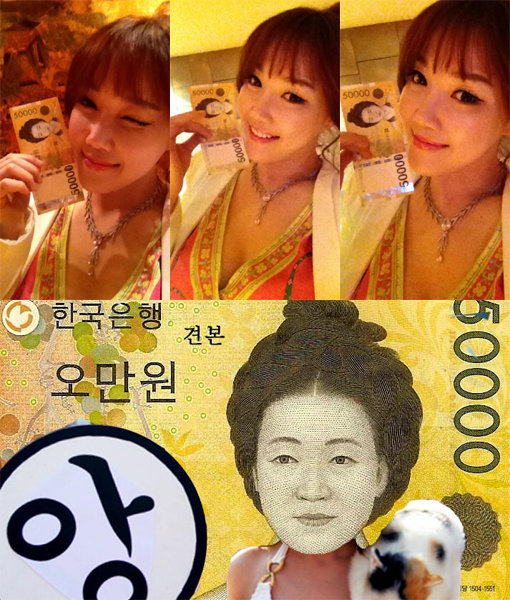 사진 속 낸시랭은 5만 권의 지폐를 든 채 카메라를 향해 깜찍한 표정을 짓고 있다. 이어 다른 사진에서 낸시랭은 5만 권 속 인물인 신사임당으로 변신했다. 자신의 노출 사진에 신사임당의 얼굴을 합성, 패러디했다.