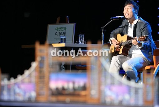 올해로 데뷔 30년째를 맞이한 가수 이문세가 12일 오후 서울 서강대 메리홀에서 열린 ‘2013 대.한.민.국 이문세’ 제작발표회에서 열창을 하고 있다. 이날 진행은 김제동이 맡았고, 가수 윤도현 등 후배 뮤지션이 참석했다.