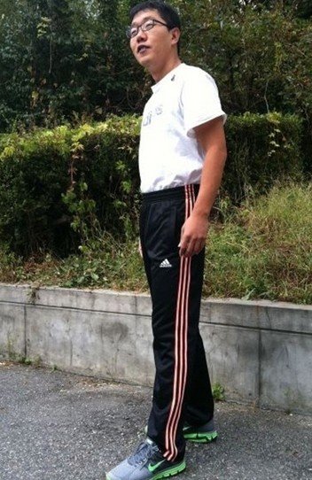 이 사진에는 김제동이흰색 반팔 티셔츠를 검은색 트레이닝 팬츠 안에 넣어 입고있는 모습이 담겨 있다.