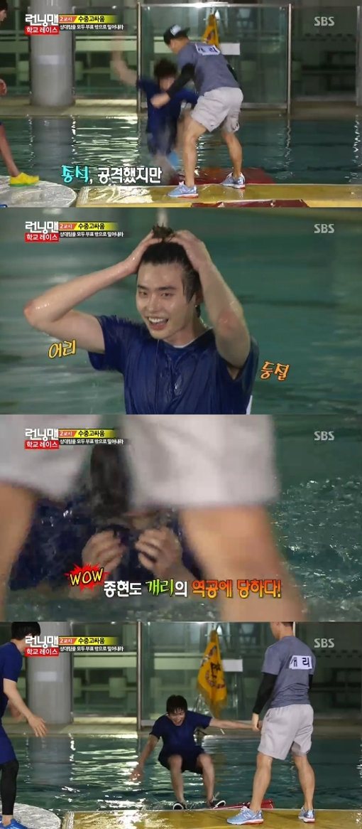 개리는 24일 방송된 SBS ‘일요일이 좋다-런닝맨’(이하 런닝맨)에서 이종석, 이종현과 차례로 수중 고싸움에서 일대일로 붙었다.
