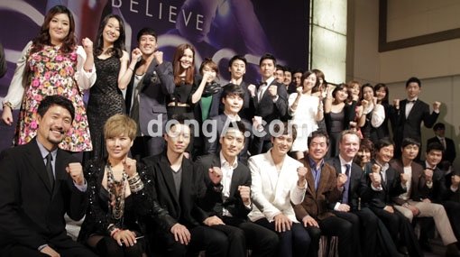 배우 김준현, 아이비, 주원 박지현, 김우형 등 출연진이 15일 오후 서울 중구 플라자호텔에서 열린 뮤지컬 ‘고스트(GHOST)’ 제작발표회에서 포타타임을 하고 있다. 영화 ‘사랑과 영혼’을 원작으로 한 최신 웨스트엔드 뮤지컬 ‘고스트’ 한국공연에는 배우 주원과 가수 아이비가 주연으로 캐스팅됐다.