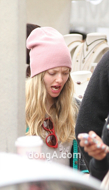 평소 패셔니스타로 잘 알려진 아만다 사이프리드는 위와 같츤 복장에 핑크색 비니를 써 멋을 더했다.