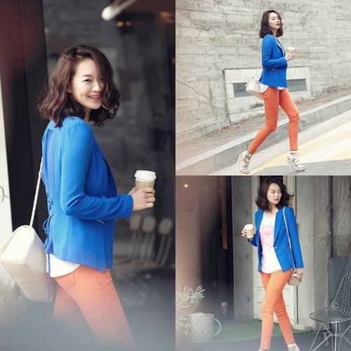 파란색 재킷에 오렌지색 스키니를 입은 신민아의 발랄한 일상 모습이 담겨 있다. 신민아가 모델로 있는 의류 브랜드에서 공개한 사진이다.