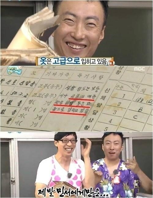 유재석은 박명수의 생활기록부를 보면서 "집은 보통으로 사나 교육에는 관심이 없고 옷은 고급으로 입힌다"고 적힌 담임교사의 소견을 읽어 웃음을 자아냈다.