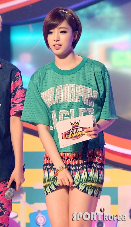 티아라 은정이 31일 서울 광진구 악스홀에서 열린 MBC 뮤직 ‘쇼챔피언’에 MC로 출연해 짧은 치마의 매무새를 고치고 있다.