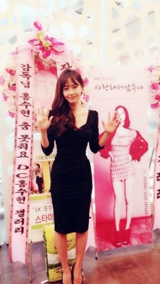 홍수현은 이 사진에서 팬들에게 받은 화환을 배경으로 검은색 드레스를 입고 미모를 뽐냈다.