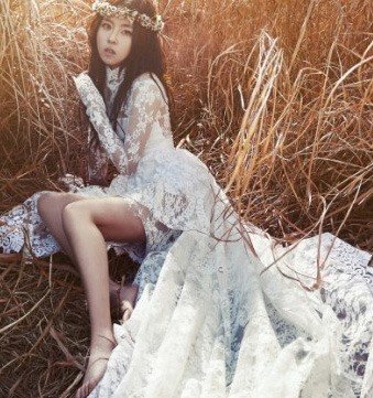 공개된 웨딩 화보 속 도희는 갈대밭에 앉아 꽃 머리 장식에 웨딩드레스를 입고 섹시한 모습으로 포즈를 취했다.