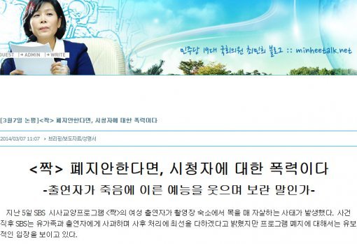 SBS ‘짝’에서 출연자가 자살하는 사건이 발생한 가운데, 최민희 민주당 의원이 프로그램 폐지를 공개적으로 촉구하고 나섰다.