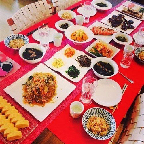 사진에는 야노시호가 자신의 시아버지 생일에 정성스럽게 차린 여러가지 음식이 담겨 있다. 식탁에는 미역국, 잡채, 나물, 김치, 볶음밥 등 다양한 한식이 자리잡았다.