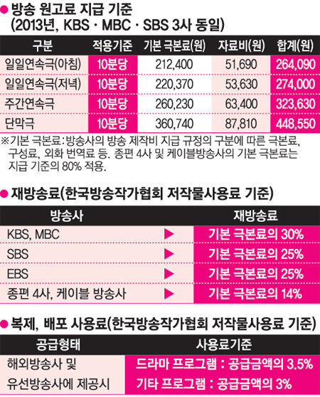 한국방송작가협회(작가협회)에 따르면 “높은 원고료는 일부 스타 작가에 한정된 것”이라고 못박는다. 작가들의 원고료는 KBS, MBC, SBS 등 지상파 방송 3사와 작가협회가 협의해 만든 방송원고료(표)를 기준으로 책정된다. 일일연속극, 주간연속극, 단막극 등에 따라 나뉘는, 말 그대로 기본 원고료다.