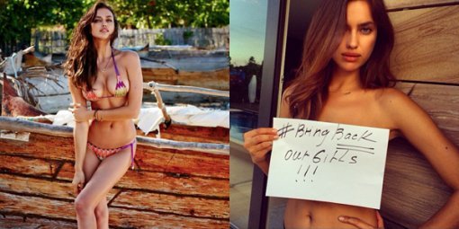 지난 11일 공개된 이 사진을 보면 이리나 샤크는 상의를 벗은 채 ‘#Bring Back Our Girls!!!’라고 쓰인 종이 한 장을 가슴 앞으로 들어 보이고 있다. 해시태그(#)와 함께 적힌 이 문구에는 나이지리아 여중생 납치 사건과 관련해 이들의 무사 귀환을 염원하는 메시지가 담겨 있다.