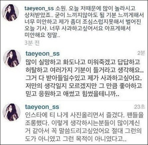 지난 19일 태연은 자신의 인스타그램 계정에 “소원(소녀시대 팬클럽). 오늘 저 때문에 많이 놀라시고 상처받았죠. 굳이 느끼지않아도 될 기분 느끼게해서 너무 미안하고 제가 조금 더 조심스럽지 못해서 벌어진 오늘 기사. 너무 사과하고 싶어서요. 아프게해서 미안해요. 정말”이라는 글을 올렸다.