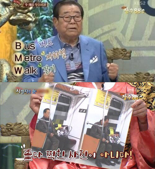 이날 방송에서는 송해가 대중교통을 이용하는 모습이 공개되기도 했다. 공개된 사진 속 송해는 노약자석에 앉아 고개를 숙이고 있다. 이에 대해 송해는 “옆에 있는 사람에게 사인을 해주고 있었던 것”이라고 해명했다.