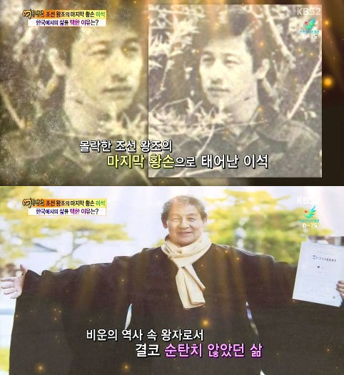 4일 방송된 KBS2 ‘여유만만’에는 조선의 마지막 황손 이석 총재가 출연해 몰락하는 조선에서 황손으로 태어나 순탄치 않았던 삶에 대해 고백했다.