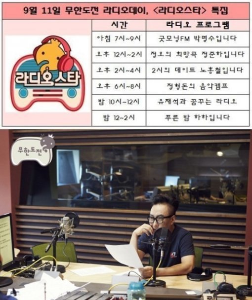 ‘무한도전’ 제작진은 공식 트위터를 통해 “둥근 해와 함께 ‘무한도전-라디오데이’가 떴습니다! 무도의 맏형 ‘고유명수’를 시작으로 여섯 DJ와 함께하는 특별한 하루! ‘무한도전-라디오스타’ 지금 당장 MBC FM4U(91.9MHz)로 에블바리 출석 첵”이라는 글을 11일 게재했다.